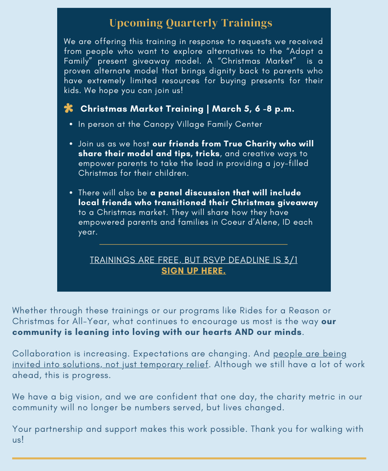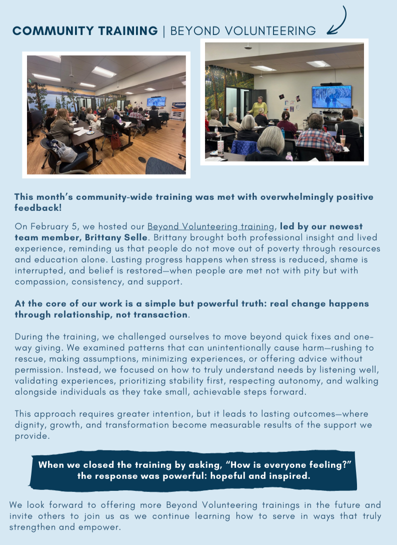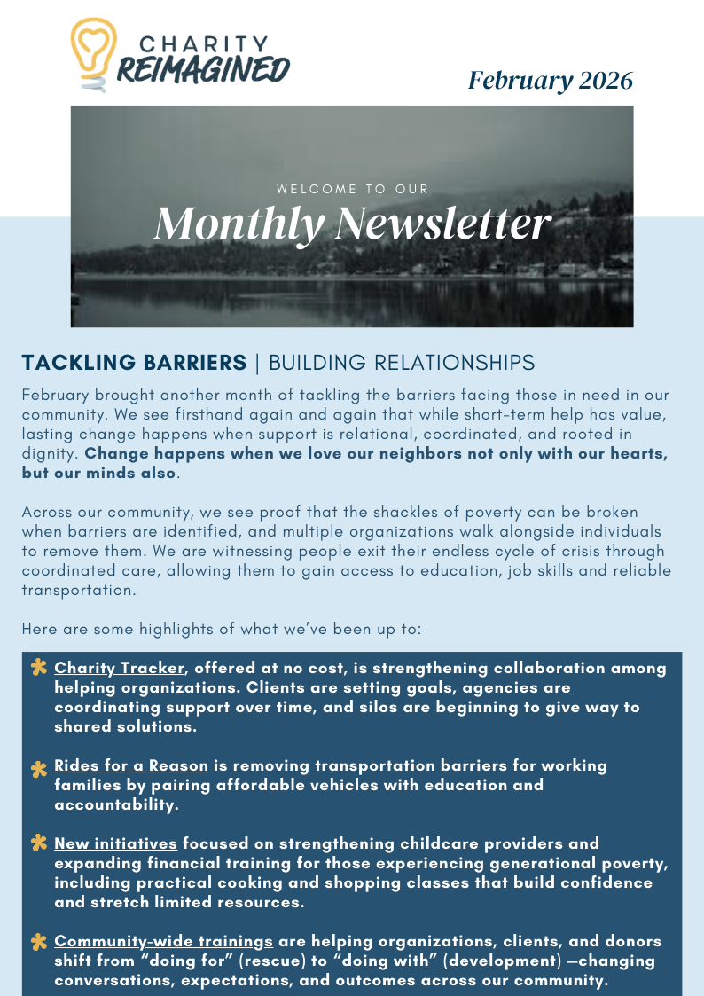 No matter how big or small, no single church, charity, or “helping” organization can meet all needs. But, by all of us working together through communication and collaboration to identify categories of care and responding appropriately, pride can replace shame, hope can replace despair, and lives can be changed.